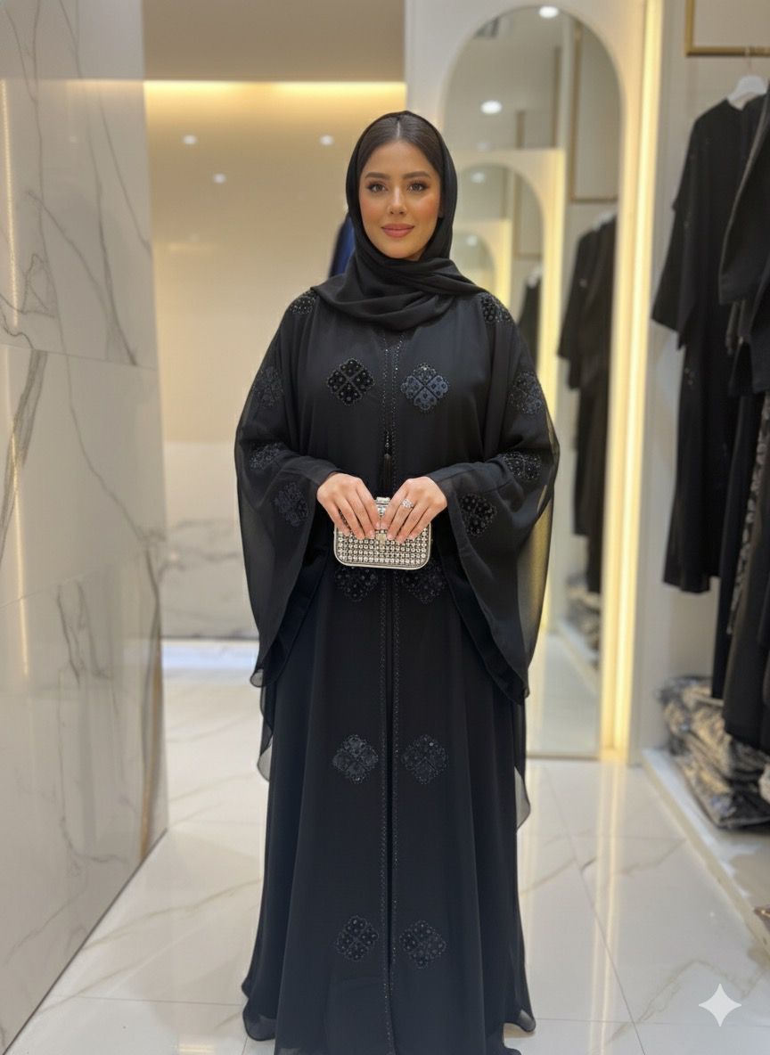 Elegance Noir’ Abaya, a garment that perfectly blends traditional grace with contemporary design. Crafted from a premium,