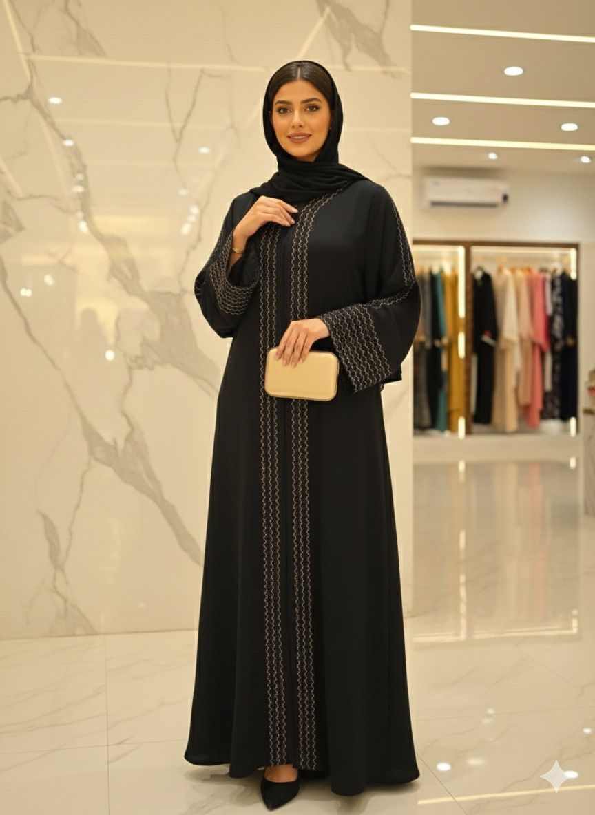 Elegance Noir’ Abaya, a garment that perfectly blends traditional grace with contemporary design. Crafted from a premium,