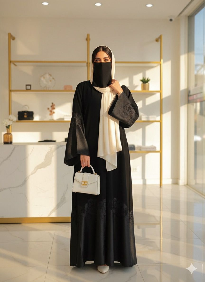 Elegance Noir’ Abaya, a garment that perfectly blends traditional grace with contemporary design. Crafted from a premium,